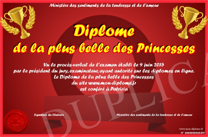 Envoyez par email votre Diplôme de la plus belle des Princesses personalisé