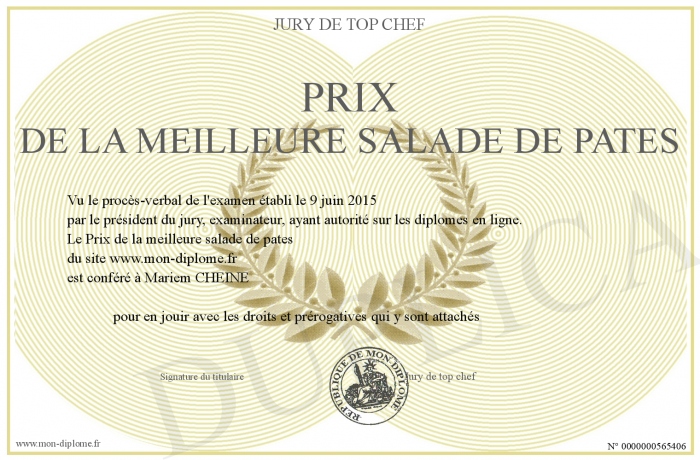 Envoyez par email votre Prix de la meilleure salade de pates personalisé