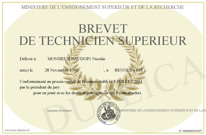 Envoyez par email votre BREVET DE TECHNICIEN SUPERIEUR personalisé