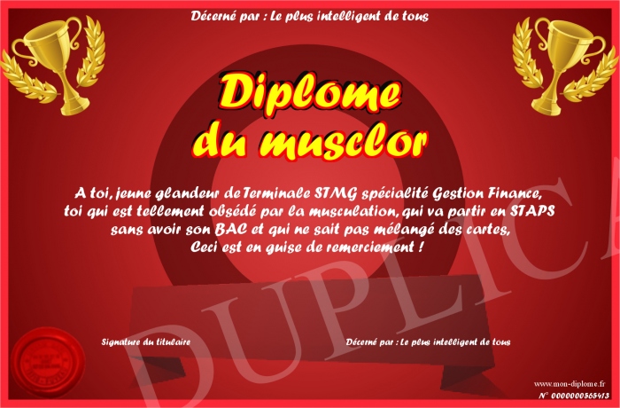 Envoyez par email votre Diplôme du musclor personalisé