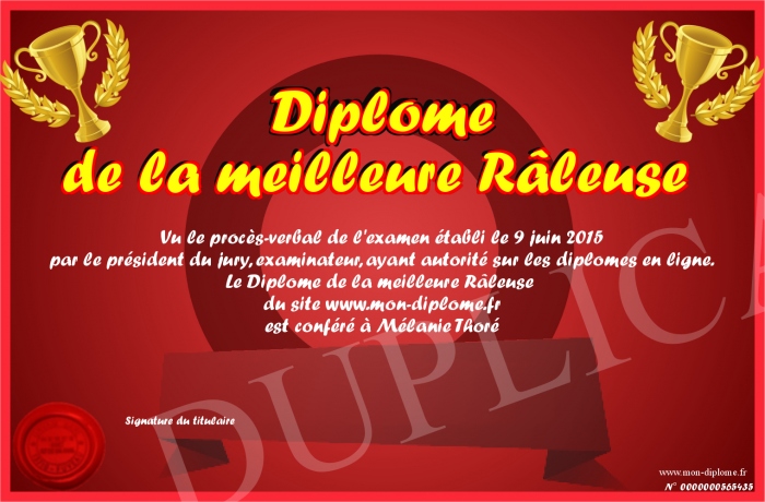 Envoyez par email votre Diplôme de la meilleure Râleuse personalisé