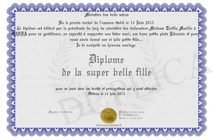 Envoyez par email votre Diplôme de la super belle fille personalisé