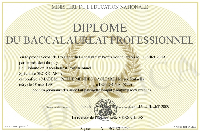 Envoyez par email votre Diplôme du baccalauréat professionnel personalisé