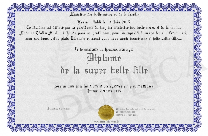 Envoyez par email votre Diplôme de la super belle fille personalisé