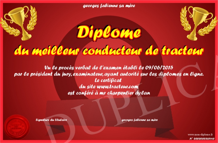 Envoyez par email votre Diplôme du meilleur conducteur de tracteur personalisé