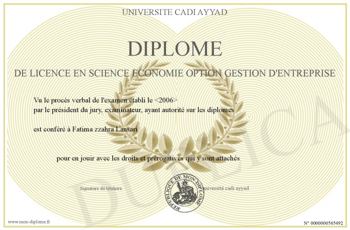 Envoyez par email votre Diplome de licence en science economie option gestion d'entreprise personalisé