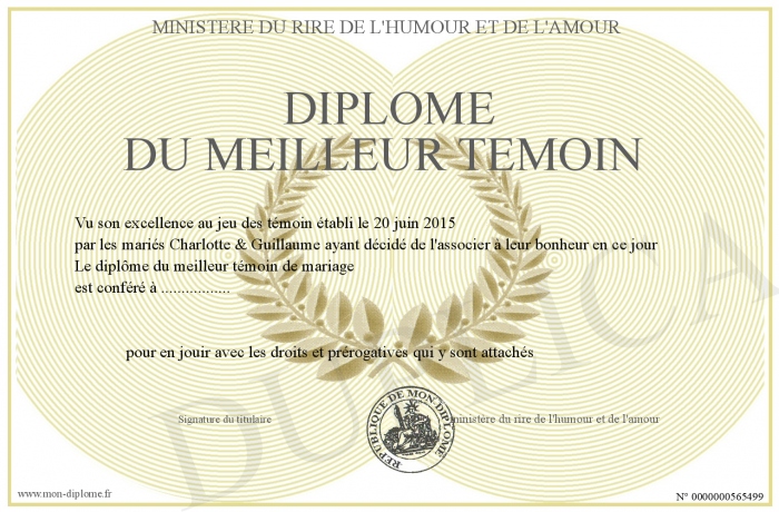 Envoyez par email votre Diplôme du meilleur témoin personalisé