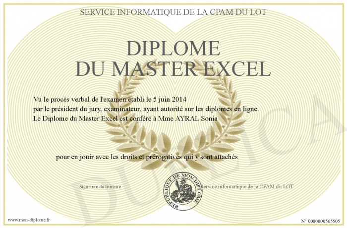 Envoyez par email votre Diplôme du Master Excel personalisé