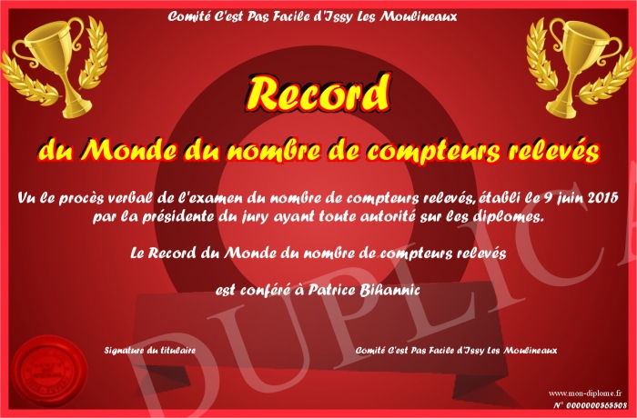 Envoyez par email votre Record du Monde du nombre de compteurs relevés personalisé