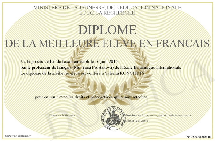 Envoyez par email votre Diplôme de la meilleure élève en francais personalisé