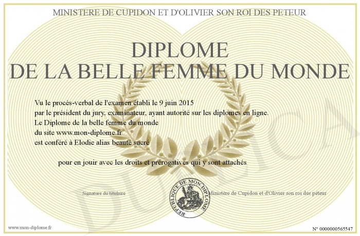 Envoyez par email votre Diplôme de la belle femme du monde personalisé