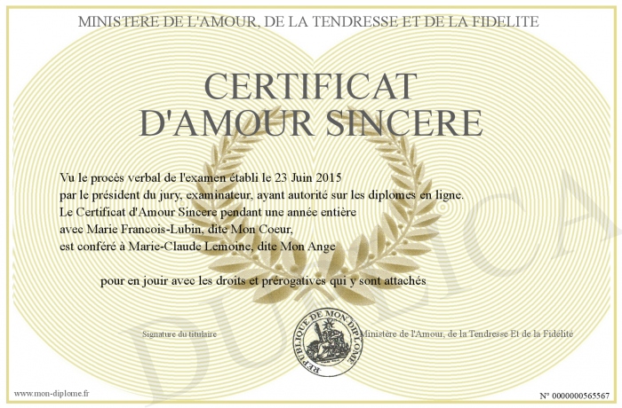 Envoyez par email votre Certificat d'amour sincere personalisé
