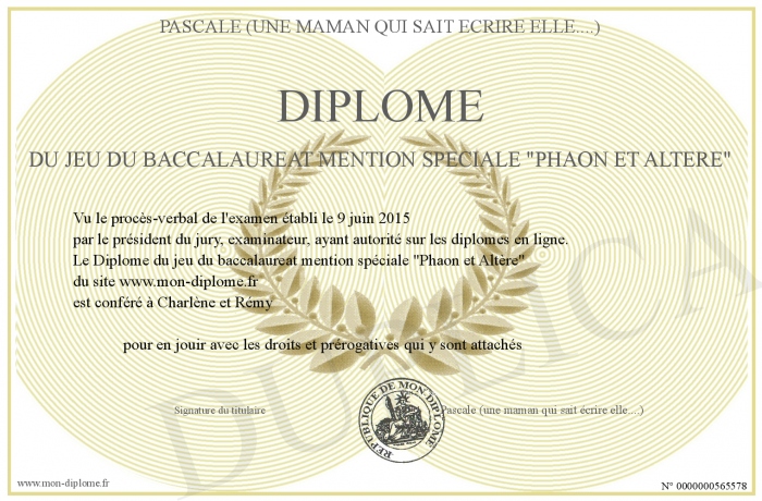 Envoyez par email votre Diplôme du jeu du baccalaureat mention spéciale -Phaon et Altère- personalisé