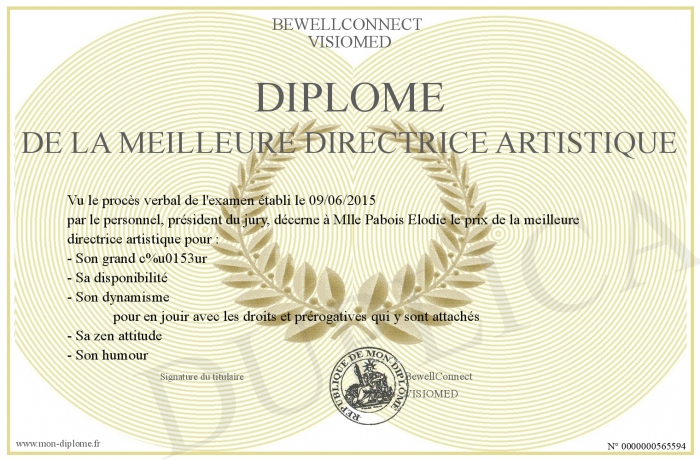 Envoyez par email votre Diplôme de la meilleure directrice artistique personalisé