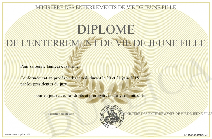 Envoyez par email votre Diplome de l'enterrement de vie de jeune fille personalisé