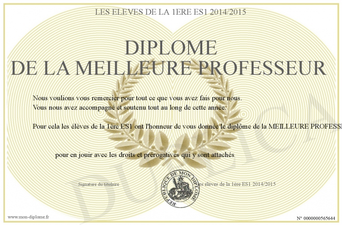 Envoyez par email votre Diplôme de la meilleure professeur personalisé