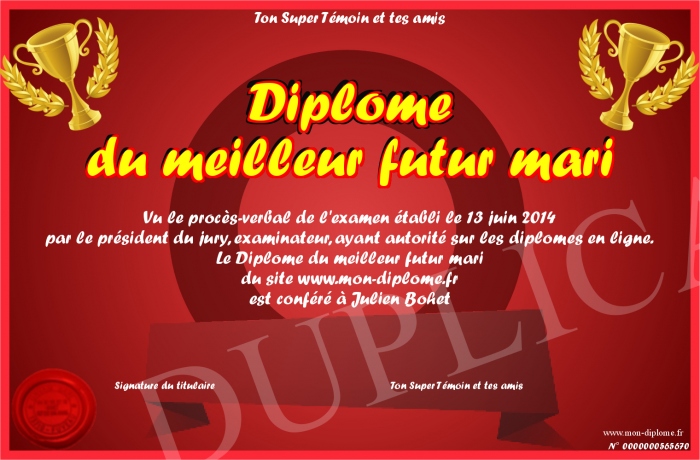 Envoyez par email votre Diplome du meilleur futur mari personalisé