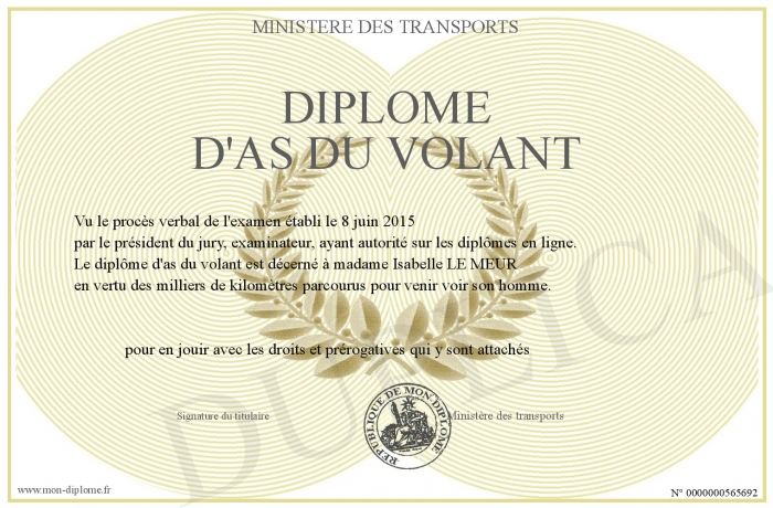 Envoyez par email votre Diplôme d'as du volant personalisé