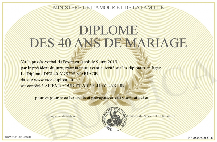 Envoyez par email votre Diplôme DES 40 ANS DE MARIAGE personalisé
