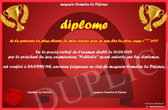 Envoyez par email votre diplôme de la patronne la plus chiante, la plus lourde pour ne pas dire la plus casse c*****e!!!! personalisé