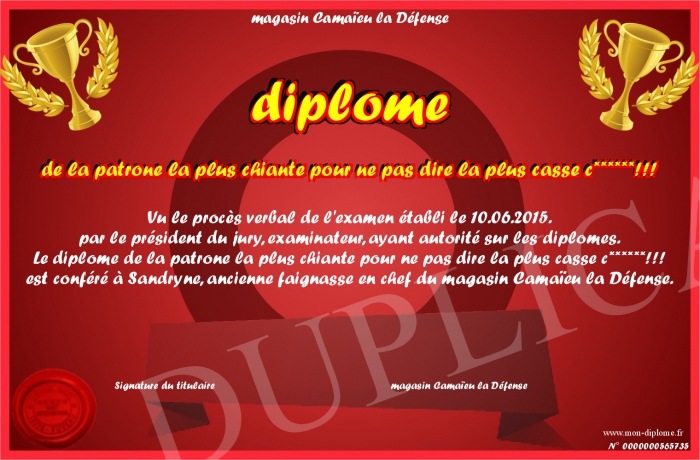 Envoyez par email votre diplôme de la patrone la plus chiante pour ne pas dire la plus casse c******!!! personalisé