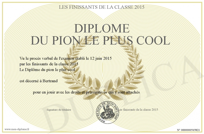 Envoyez par email votre Diplôme du pion le plus cool personalisé