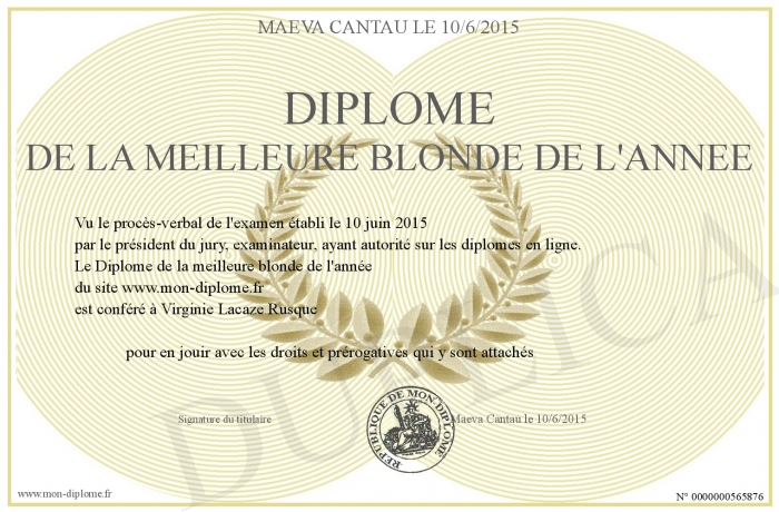 Envoyez par email votre Diplôme de la meilleure blonde de l'année personalisé