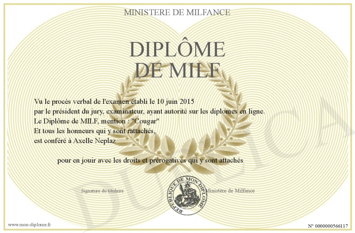 Envoyez par email votre DIPLÔME DE MILF personalisé