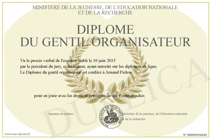 Envoyez par email votre Diplôme du gentil organisateur personalisé