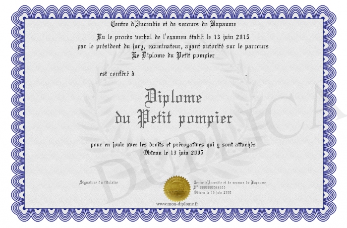 Envoyez par email votre Diplôme du Petit pompier personalisé