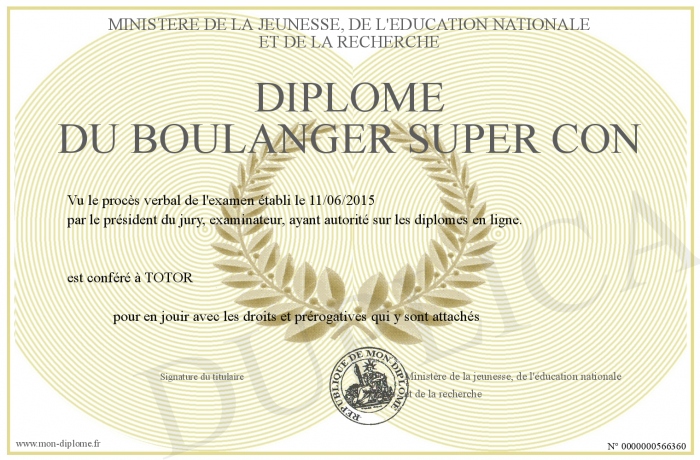 Envoyez par email votre Diplôme du boulanger super con personalisé
