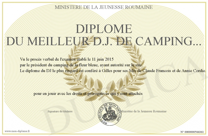 Envoyez par email votre Diplôme du MEILLEUR D.J. de Camping... personalisé