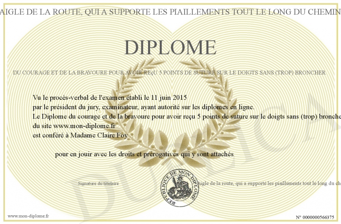 Envoyez par email votre Diplôme du courage et de la bravoure pour avoir reçu 5 points de suture sur le doigts sans (trop) broncher personalisé
