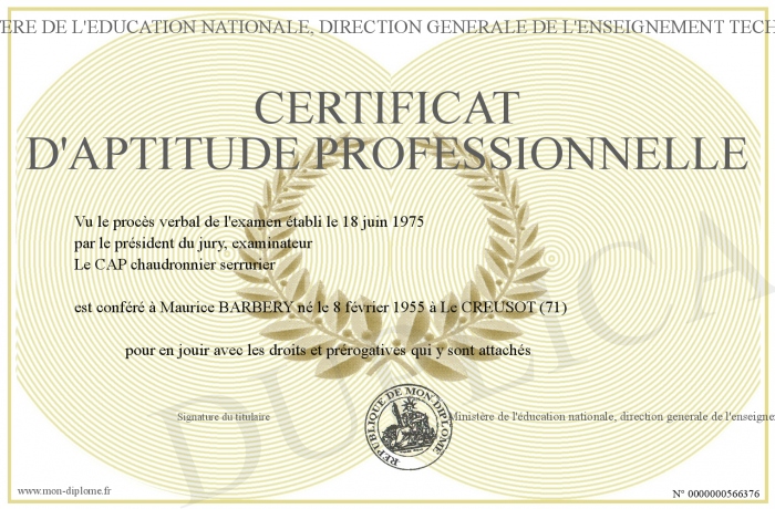 Envoyez par email votre Certificat d'Aptitude Professionnelle personalisé