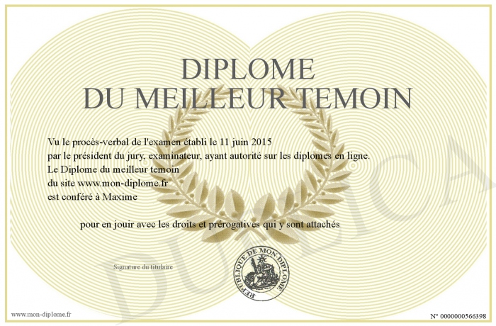 Envoyez par email votre Diplôme du meilleur temoin personalisé
