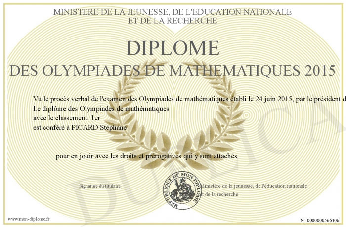 Envoyez par email votre Diplôme des Olympiades de mathématiques 2015 personalisé