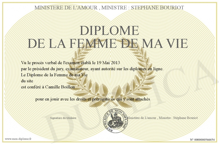 Envoyez par email votre DIPLOME DE LA FEMME DE MA VIE personalisé