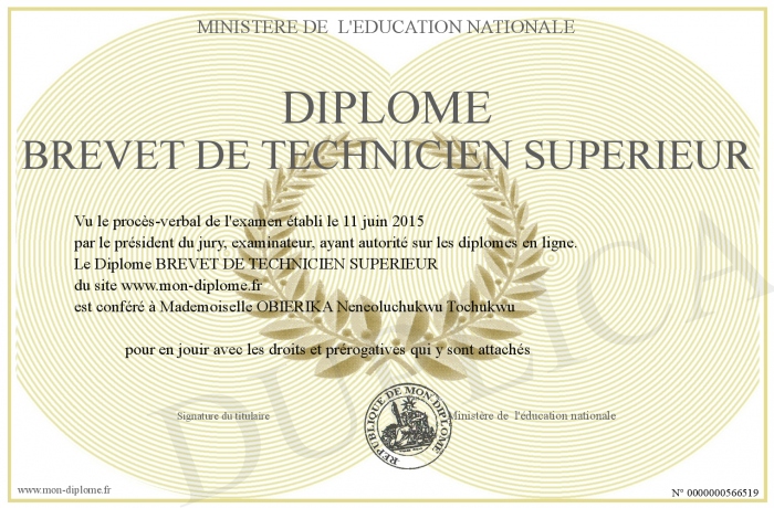 Envoyez par email votre Diplome BREVET DE TECHNICIEN SUPERIEUR personalisé