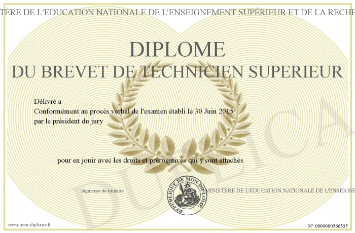 Envoyez par email votre Diplôme du BREVET DE TECHNICIEN SUPERIEUR personalisé