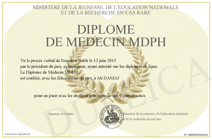 Envoyez par email votre Diplôme de Médecin MDPH personalisé