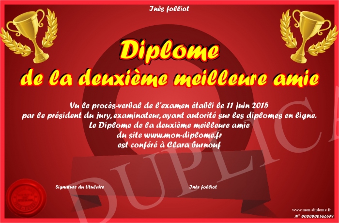 Envoyez par email votre Diplôme de la deuxième meilleure amie personalisé