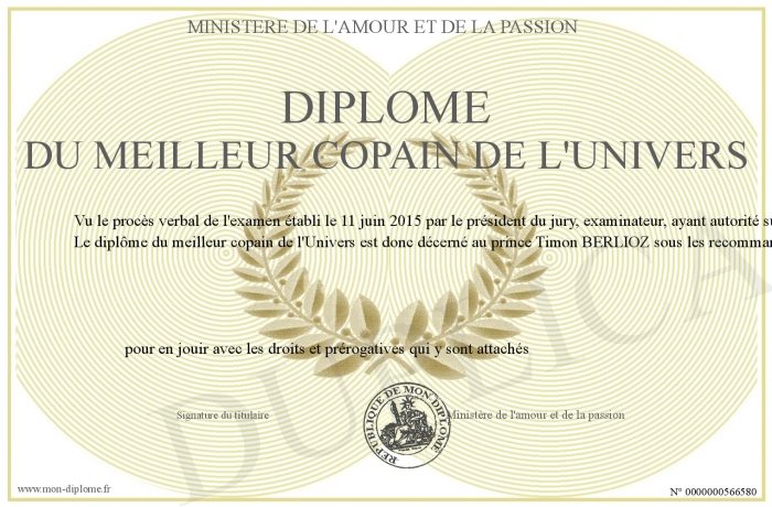 Envoyez par email votre Diplôme du meilleur copain de l'Univers personalisé