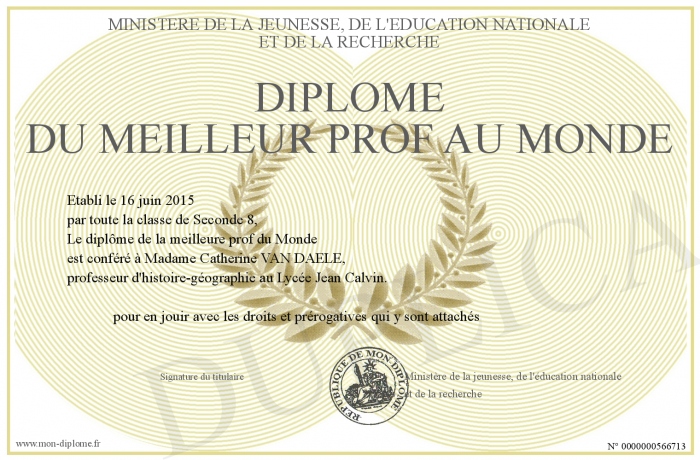 Envoyez par email votre Diplôme du meilleur prof au monde personalisé