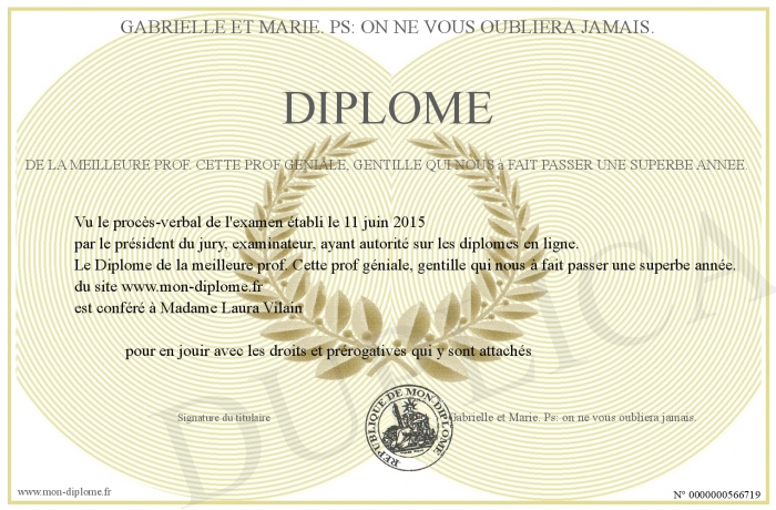 Envoyez par email votre Diplôme de la meilleure prof. Cette prof géniale, gentille qui nous à fait passer une superbe année. personalisé