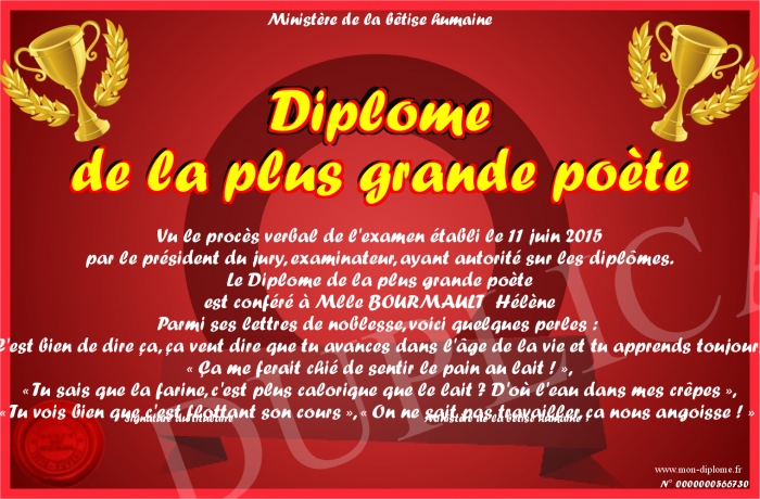 Envoyez par email votre Diplôme de la plus grande poète personalisé
