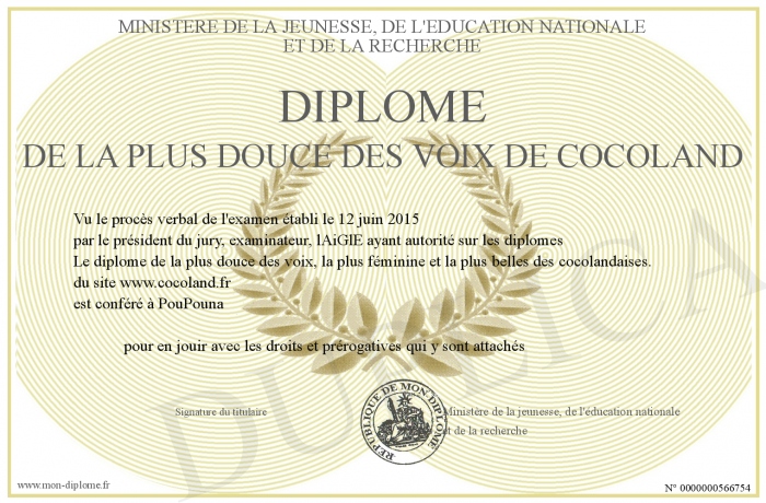 Envoyez par email votre Diplôme de la plus douce des voix de cocoland personalisé