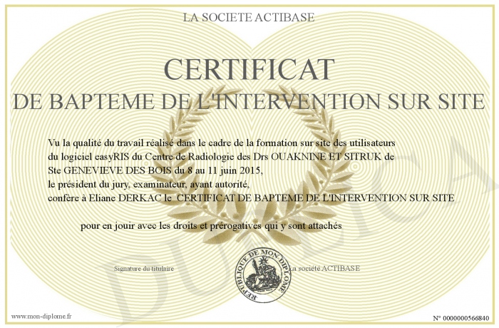 Envoyez par email votre CERTIFICAT DE BAPTEME DE L'INTERVENTION SUR SITE personalisé