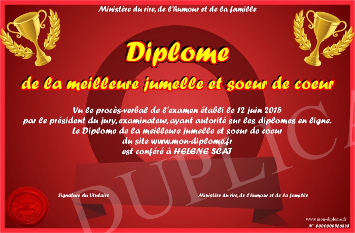 Envoyez par email votre Diplôme de la meilleure jumelle et soeur de coeur personalisé