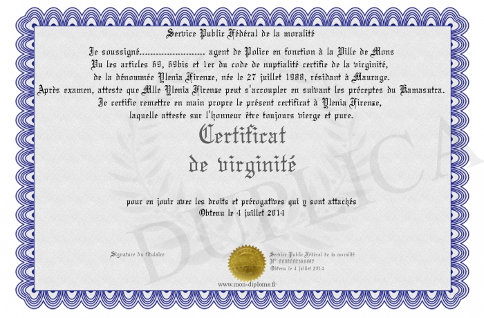Envoyez par email votre Certificat de virginité personalisé