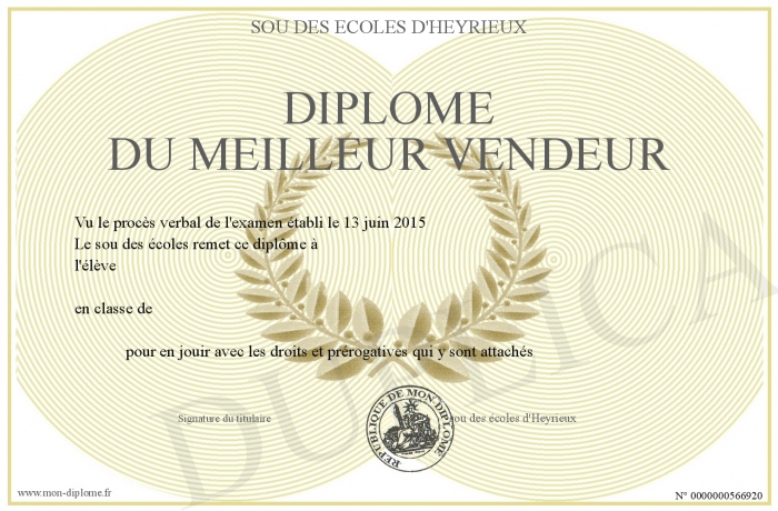 Envoyez par email votre Diplôme du meilleur vendeur personalisé